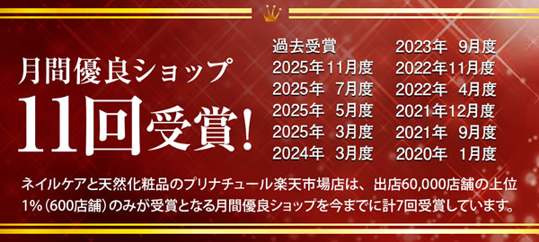 ネイルケアやボディケアなどの当社オリジナルの天然化粧品を多数扱う「プリナチュール楽天市場店」ではこの度、2025年11月度の月間優良ショップを受賞いたしました。